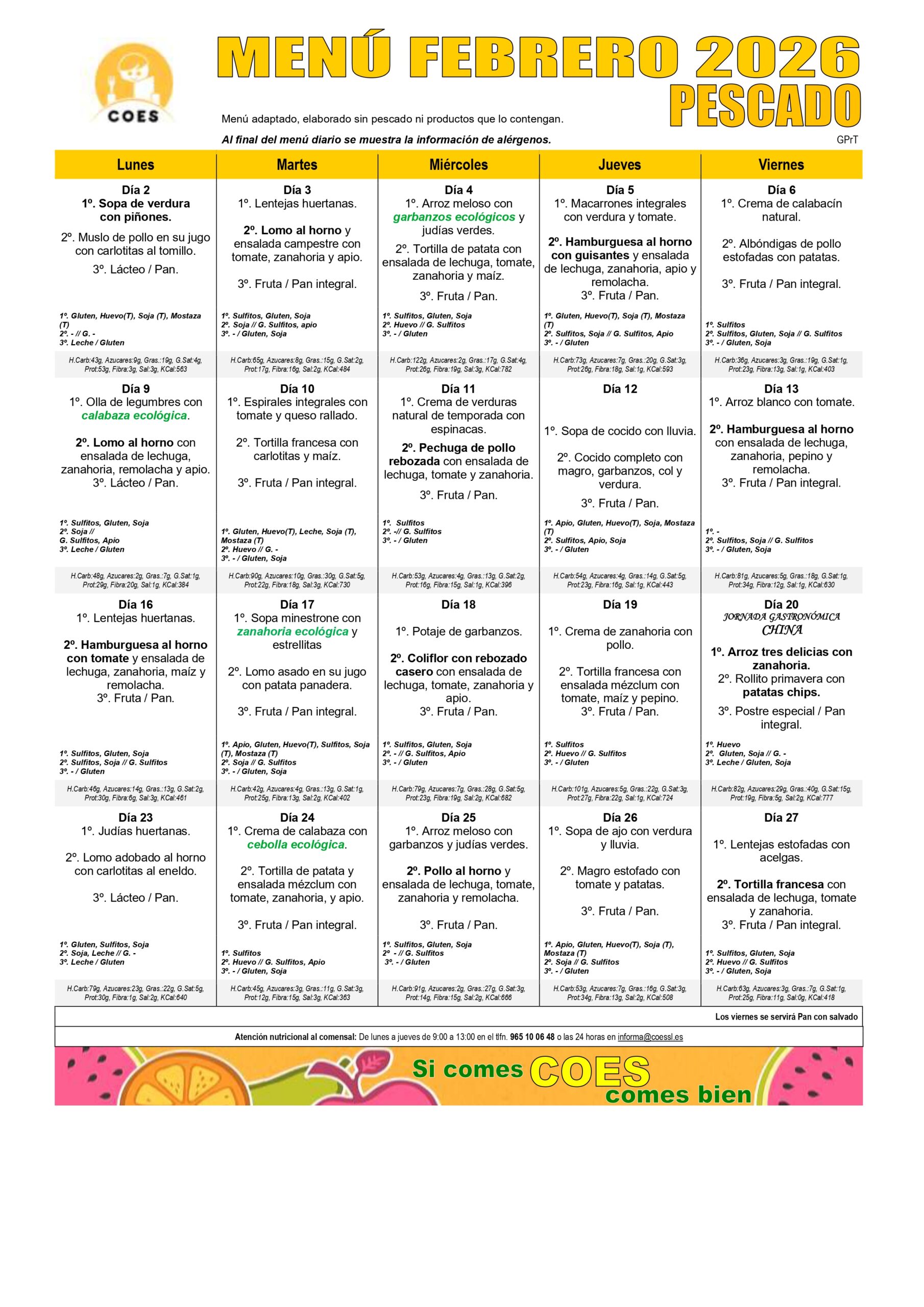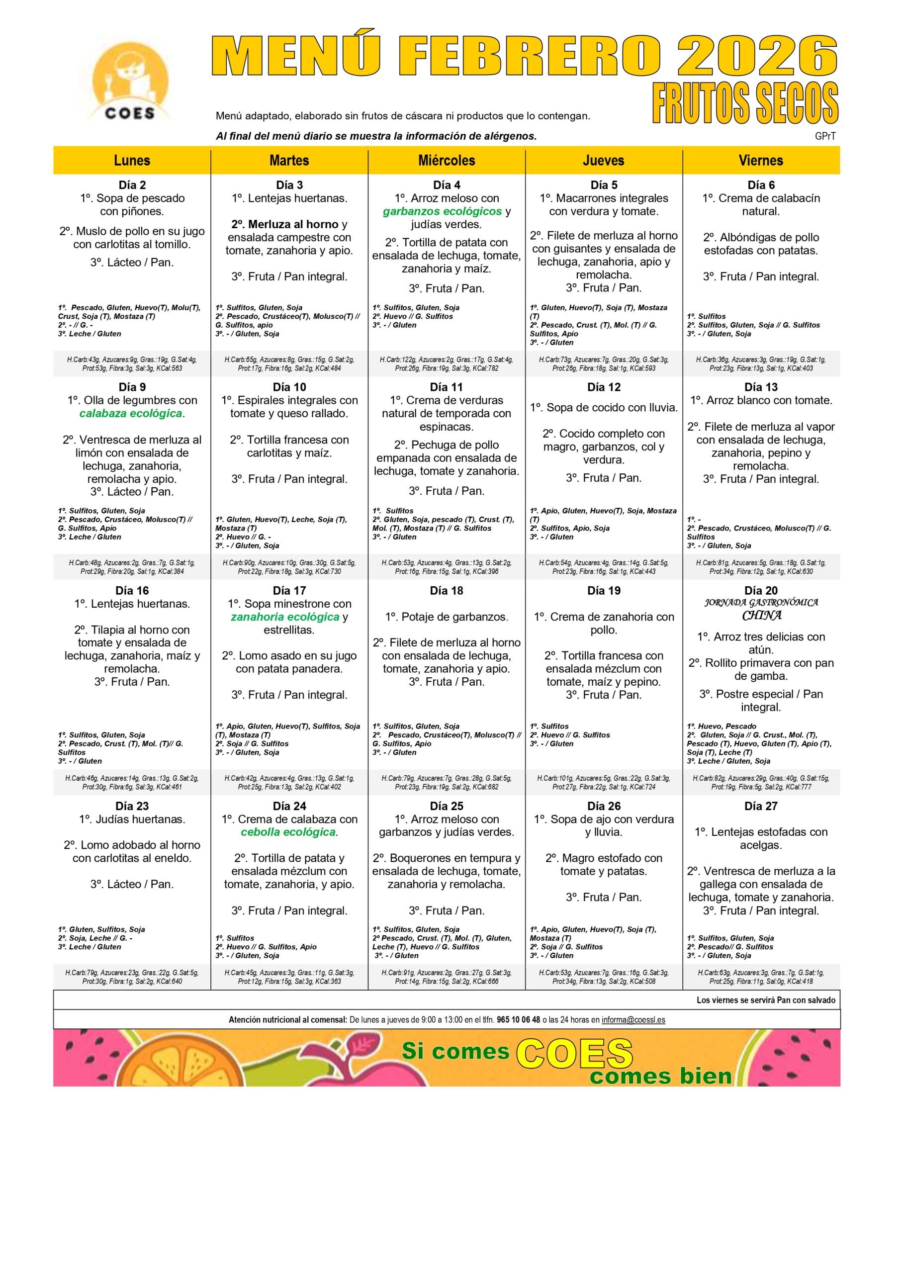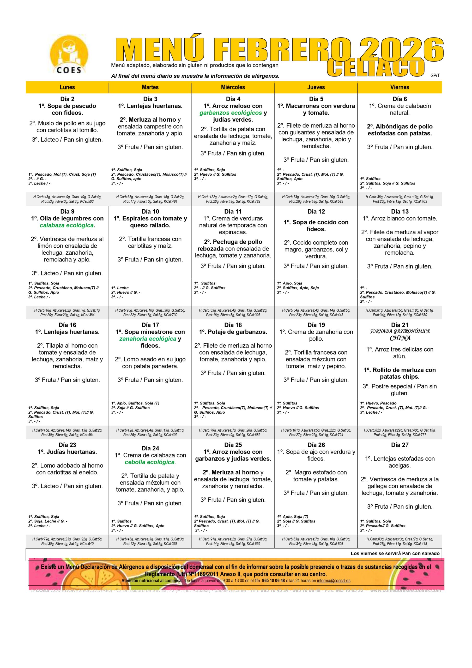 El centro cuenta también con menús adaptados para el alumnado que presente alergias, intolerancias o tipos de alimentación. Este hecho es muy importante que a la hora de matricular al alumnado en el centro o durante su estancia quede bien comunicado y justificado con los pertinentes certificados médicos.