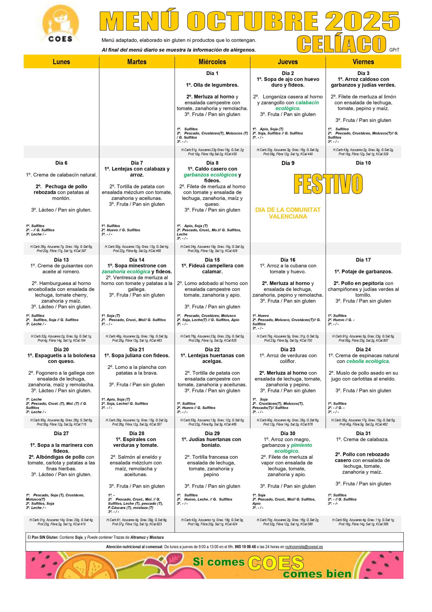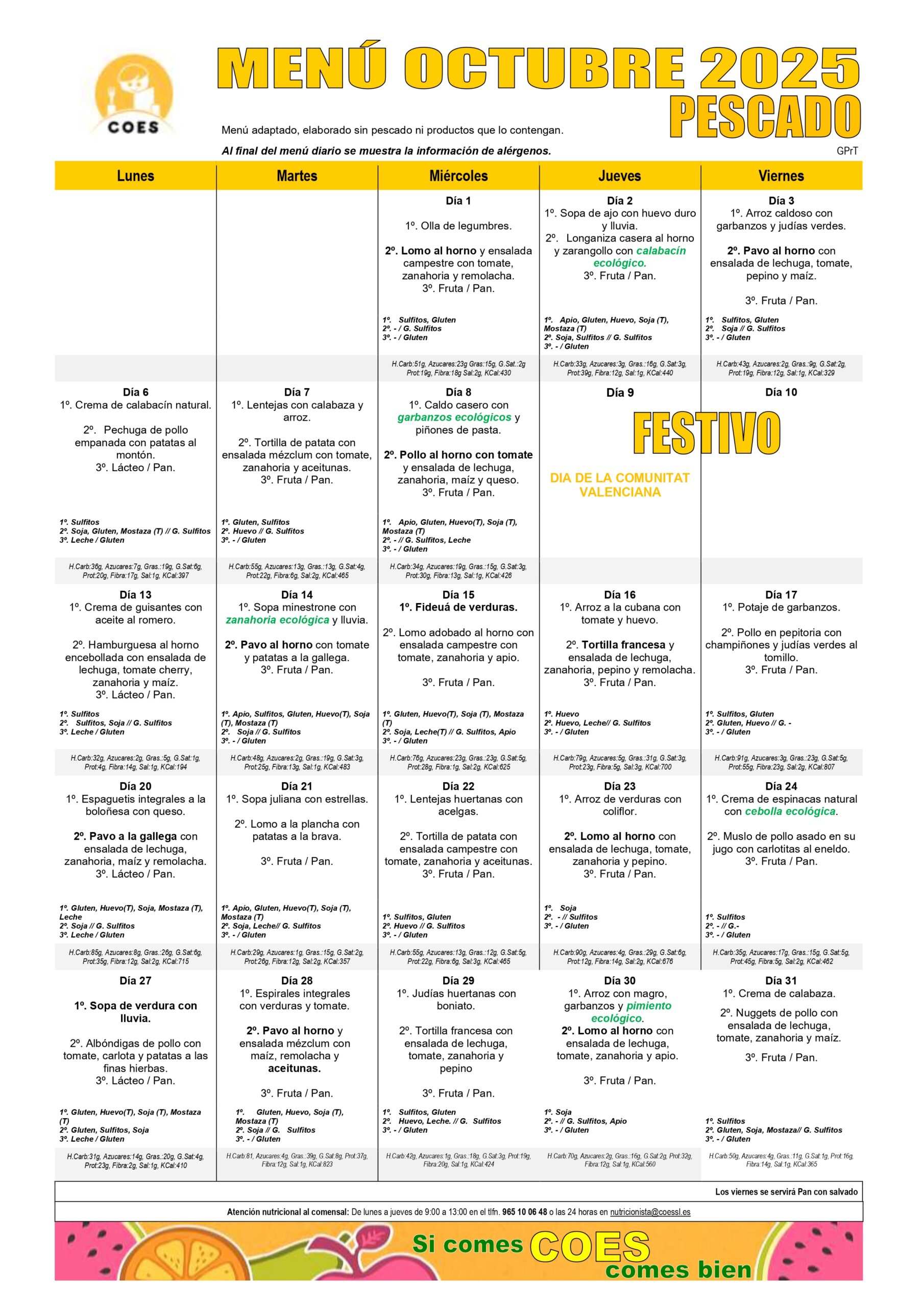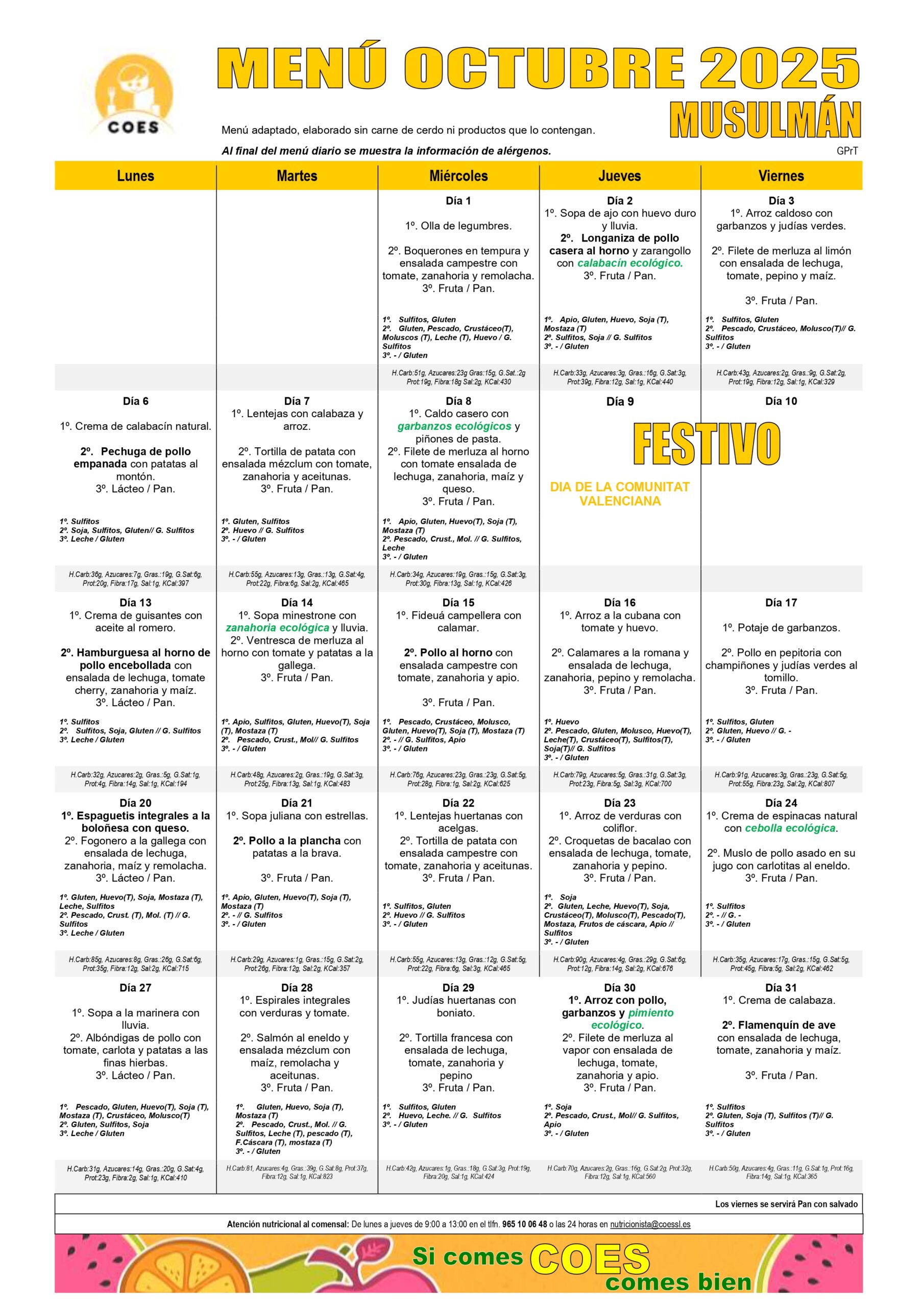 El centro cuenta también con menús adaptados para el alumnado que presente alergias, intolerancias o tipos de alimentación. Este hecho es muy importante que a la hora de matricular al alumnado en el centro o durante su estancia quede bien comunicado y justificado con los pertinentes certificados médicos.